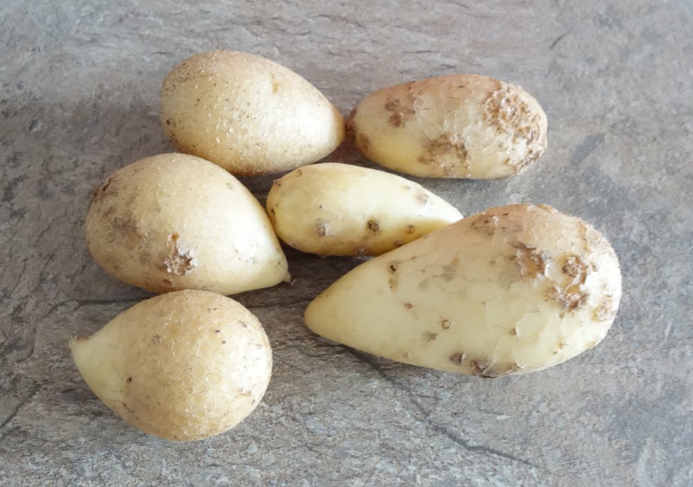 Unless the potatoes are very badly affected by scab, simply peeling them will result in unmarked potatoes which as good as scab-free potatoes. The picture below shows one of the potatoes above after it has been peeled.